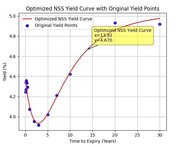 Programmed Nelson-Svennson-Siegel Algorithm in Python to calculate the U.S. Treasury Federal Funds Raterisk-free rate at any point in the range of years 2025-2055, used in risk-neutral derivative asset pricing strategies.